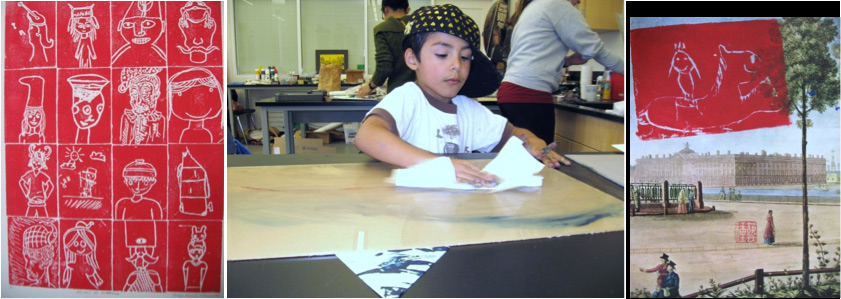 Don Quixote. There, they learned first-hand about book making and relief printing and went on to make their own Quixote-inspired collages, puppets, and films, including the linoleum and styrofoam block prints on display at the Press. The evening will include a 45 minute program with readings and music including